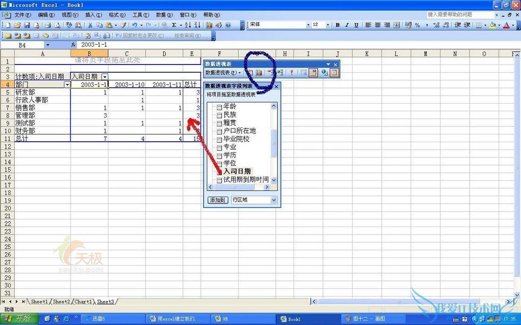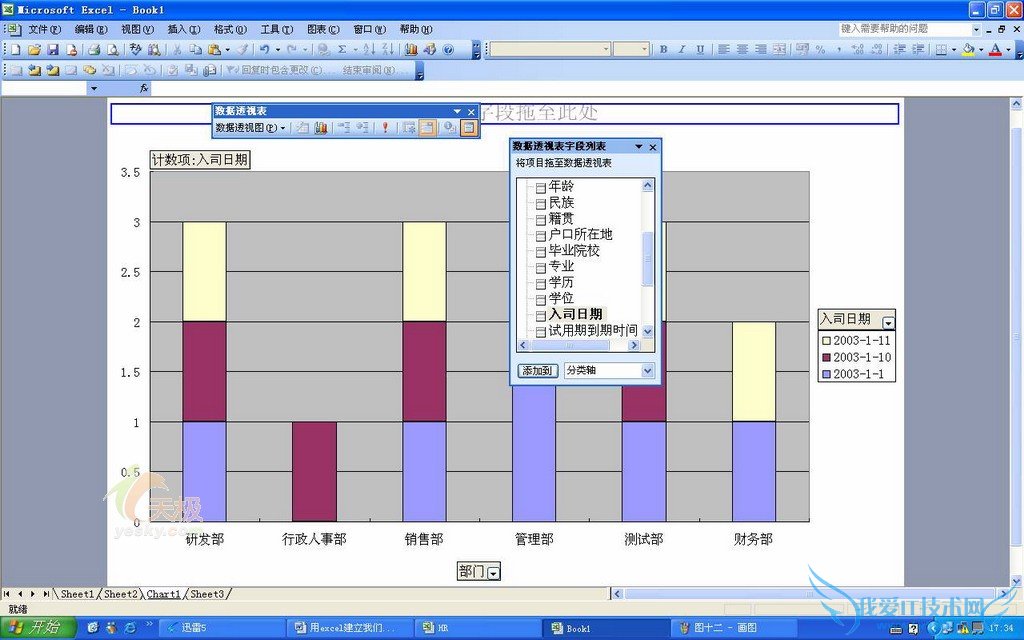 例如我们现在想统计各部门2003年入职人员情况。我们便可以将相关项目用鼠标托至指定位置,如图(十二)红色箭头显示。通过对信息项目的拖拽,系统会自动出现相关信息的统计数据。如果我们还想出现统计数据的图示,这时我们可以点击数据透视表编辑菜单栏上的图例图标,如图(十二)蓝圈圈住的地方。这时会出现chart1,如图(十三)所示。如果我们想改变图例显示类型可以点击图表向导进行自由选择。
