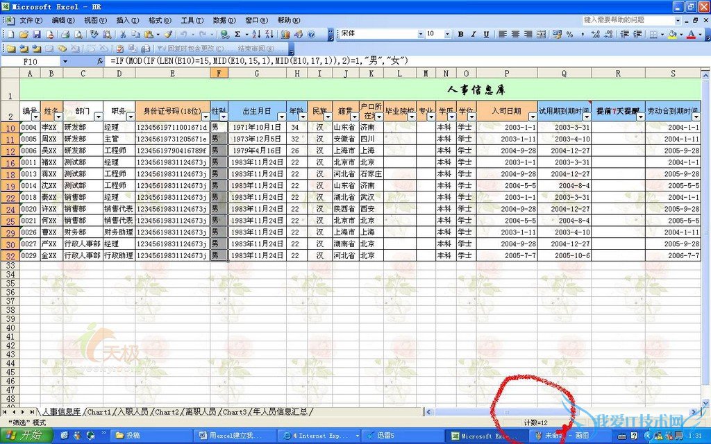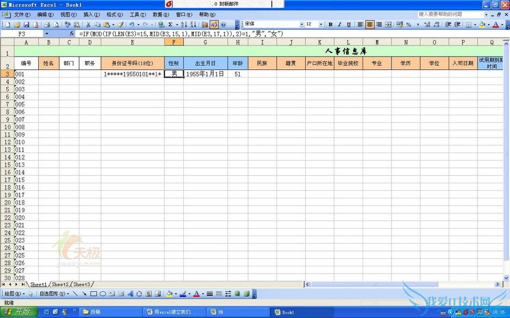 (1)性别:=IF(MOD(IF(LEN(E3)=15,MID(E3,15,1),MID(E3,17,1)),2)=1,"男","女")