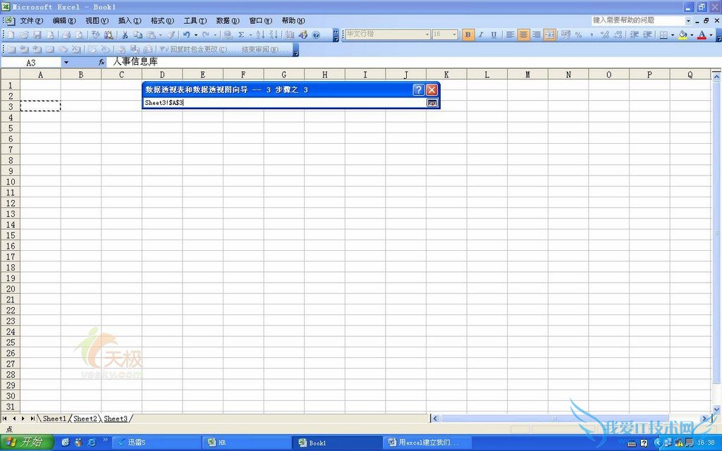 选择“数据透视表”接下来点击“下一步”即可,我们需要确定建立数据透视表的数据源区域,一般系统会自动将整个信息库区域设置成我们要选择的区域。在出现“数据透视表和数据透视图向导-3”第3步时我们选择“现有工作表”,将工作表区域选择在新的sheet中A3单元格” 如图(十一)。点击“完成”后,便会出现(图(十二))结果。这里解释一下我们为什么要选择A3单元格,这主要是因为显示区上面有两行用来放置页字段。