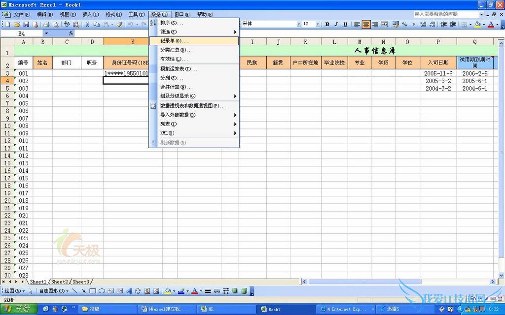 通过对一些人事信息项进行函数设置后,我们便可以开始录入信息了。逐行的键入人事信息,会让人很快产生疲劳感,甚至会出现串行或输错信息的工作失误。我们可以采用Excel自带的“记录单”功能来解决这个问题。请点击编辑栏中的“数据”―“记录单”如图(三)我们可以用“Tab键进行项目的换行录入如图(四)。”