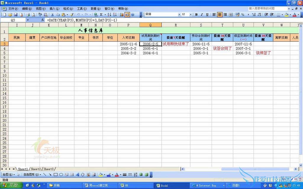 在这里我们假设试用期为3个月,我们需要在Q3单元格中输入上述公式,其中MONTH(P3)+3表示在此人入职时间月的基础上增加三个月。而DAY(P3)-1是根据劳动合同签订为整年正月而设置的。比如2005年11月6日到2006年11月5日为一个劳动合同签订期。