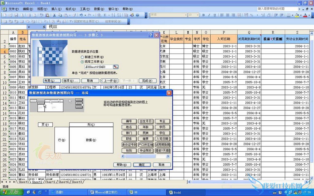 通过这个功能我们可以很容易的统计出各种人事资料,比如学历构成,性别比例等。同时您还可以根据自己的需要来设置布局。当出现“数据透视表和数据透视图向导”第3步时,我们可以点击“布局”按钮,接下来会出现“数据透视表和数据透视图向导-布局”在这里我们可以通过对话框中右侧的数据按钮添加或删除我们需要的数据项。如图(十四)