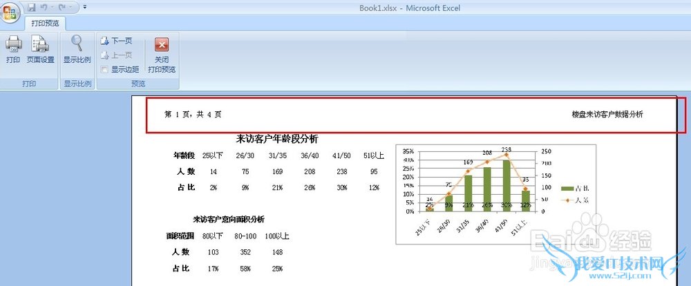 5 设计好了页眉,页脚的原理是一样的,按照自己的用处设计好之后,我们点“打印预览”就可以看到最终打印现来的效果了:
