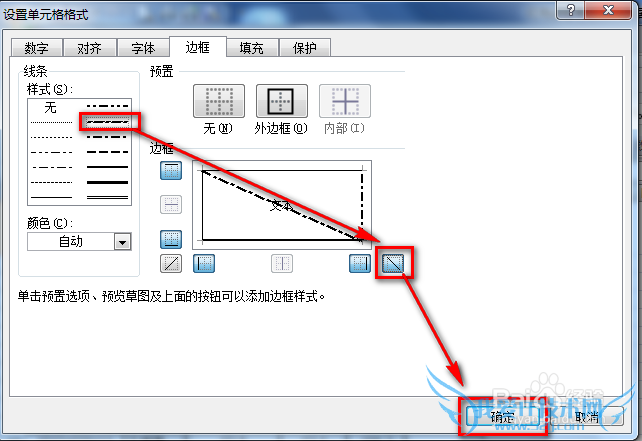 在边框选项卡中选择斜线线条的类型,然后单击“斜线”后,单击“确定”: