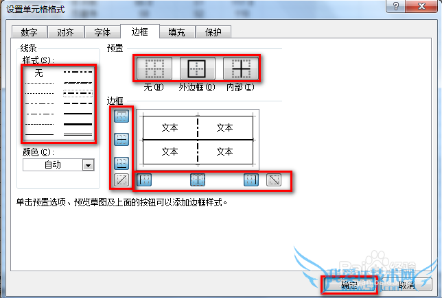 单击“边框”选项卡,然后根据需要,选择线条的样式,和要添加边框线的部分,之后单击“确定”,即可给表格添加上边框线条: