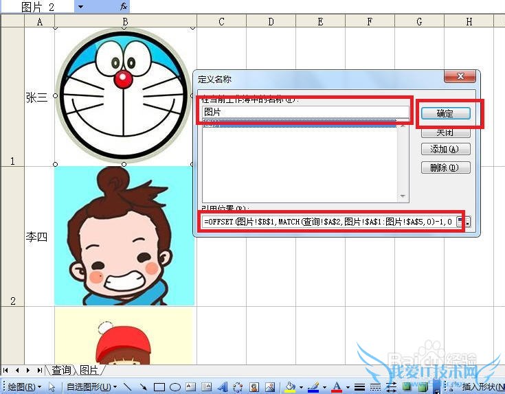 3.ÔÚ¹¤×÷±íÖеã»÷¡°²åÈ롪¡ªÃû³Æ¡ª¡ª¶¨Ò塱£¬ÊäÈ붨ÒåµÄÃû³Æ¡°Í¼Æ¬¡±£¬ÒýÓÃλÖÃÊäÈ빫ʽ¡°=OFFSET(ͼƬ!$B$1,MATCH(²éѯ!$A$2,ͼƬ!$A$1:ͼƬ!$A$5,0)-1,0)¡±