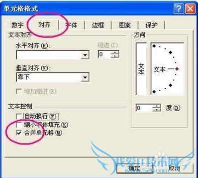 合并单元格:选中要合并的若干单元格后,单击菜单“格式”=》“单元格”,然后单击“对齐”选项卡,勾选“合并单元格”选项。