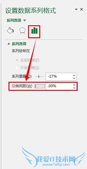 在右侧的设置数据系列格式中,点击填充柱选项卡,然后设置 分类间距 为0: