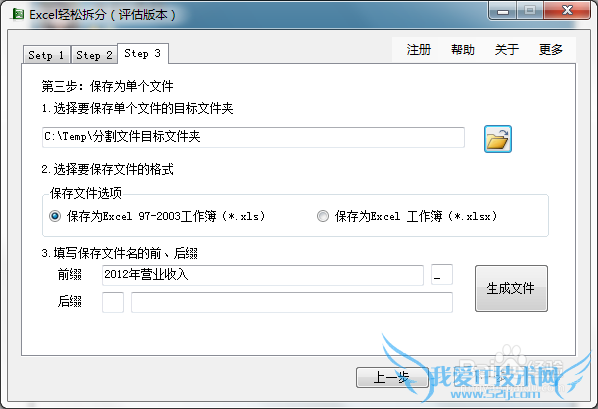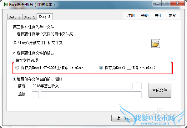 有两个选项,该软件支持 Excel 97-2003年工作簿 (*.xls) 和 Excel 工作簿 (*.xlsx)格式。