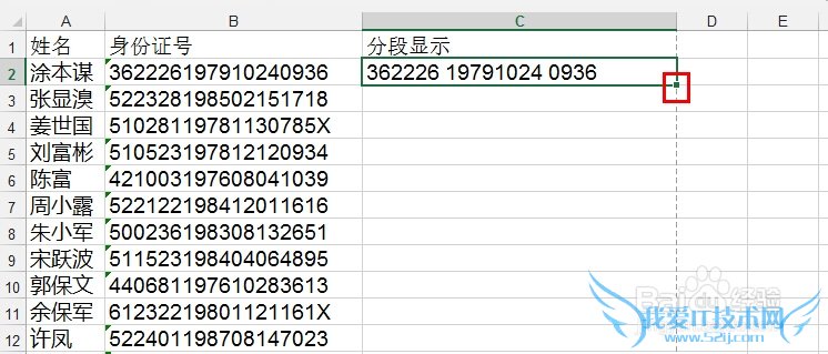 本例是对身份证号进行分段显示。18位身份证号组成格式是 6位区域代码+8位出生年月日+4位识别码,因此对身份证号码进行 6-8-4 格式的分段显示。