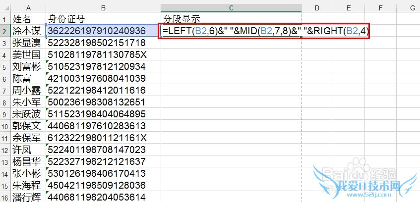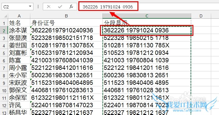 如下所示,需要分段显示的单元格位于B列。在C2单元格输入公式=LEFT(B2,6)&" "&MID(B2,7,8)&" "&RIGHT(B2,4) 后按回车: