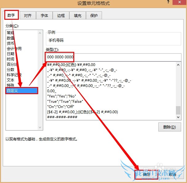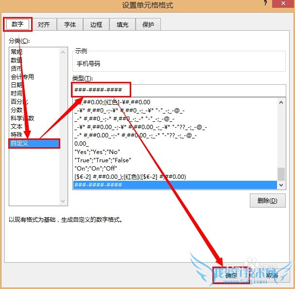 点击 数字 选项卡,然后选择 自定义,在右侧输入 ###-####-#### 后(按1-4-4格式分节,如果用户喜欢4-3-3格式手机号,则输入####-###-###即可),点击 确定。