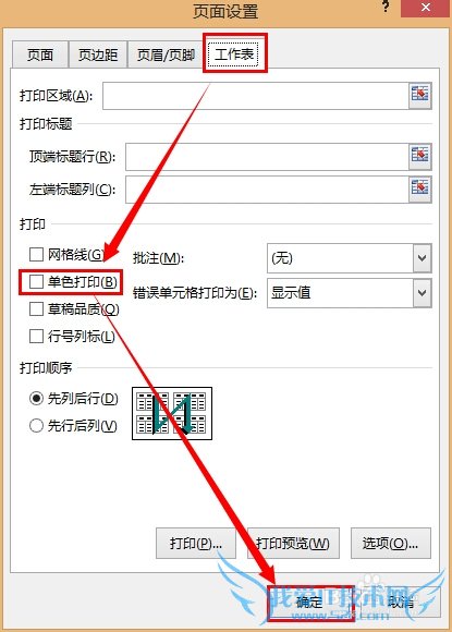 点击 工作表 选项卡,然后勾选 单色打印 后,点击 确定 :