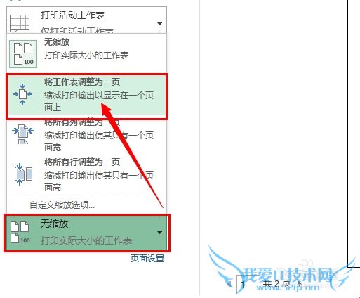 点击 自定义缩放选项 下的下拉列表,然后选择 将工作表调整为一页 :