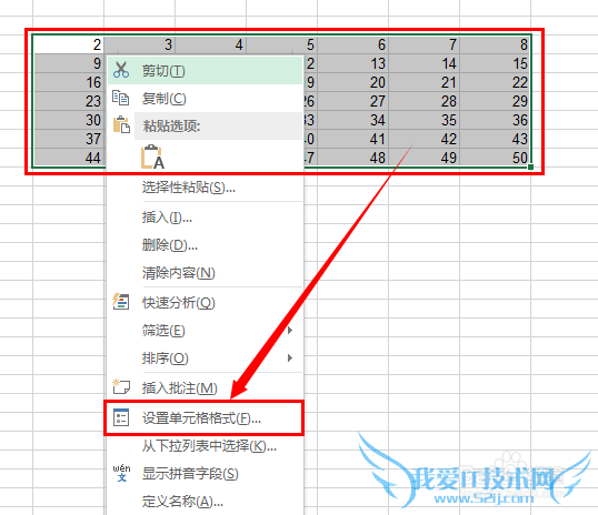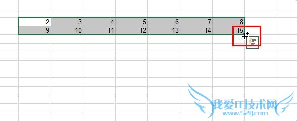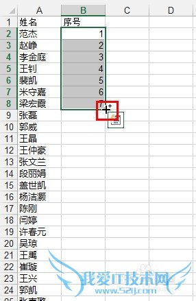 在本表格的空白位置输入 如下数据 。注意,因为姓名列的数据是从 2 开始的,所以在此处输入的数字是从 2 开始,然后向右序列编号到第 7 个数字,即数值 8 结束。输入两行数据之后,然后拖拽最后一个单元格右下角的黑色块,向下填充 5 行,即填充到数字 44 (最后一个数字为50):