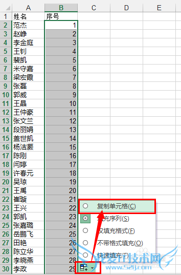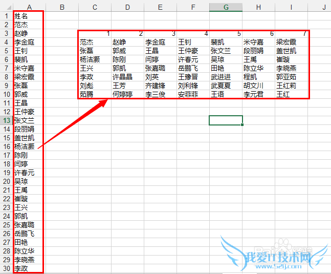 如果需要转换成行的数据,每行为 7 个名字,那么,请在 姓名 列的右侧,输入数字1-7。然后选择这 7 个单元格,双击 7 单元格右下角的黑色块: