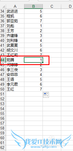 向下拉到列数据的最下面,然后确认一下最后一组7个名字的行标题,本文中最后一组行标题为 44 :