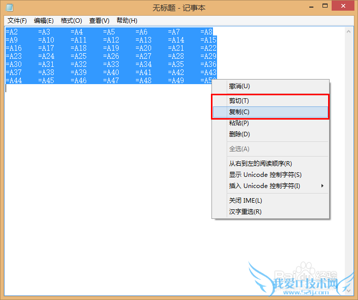 全选粘贴的所有数据,右击,选择 剪切 或者 复制 :