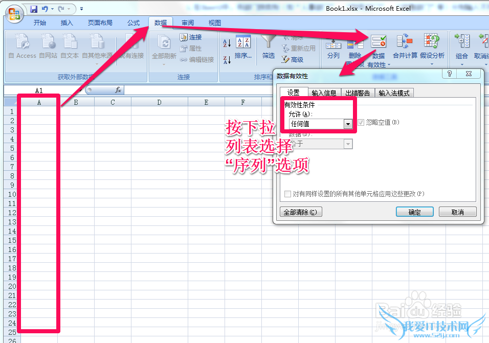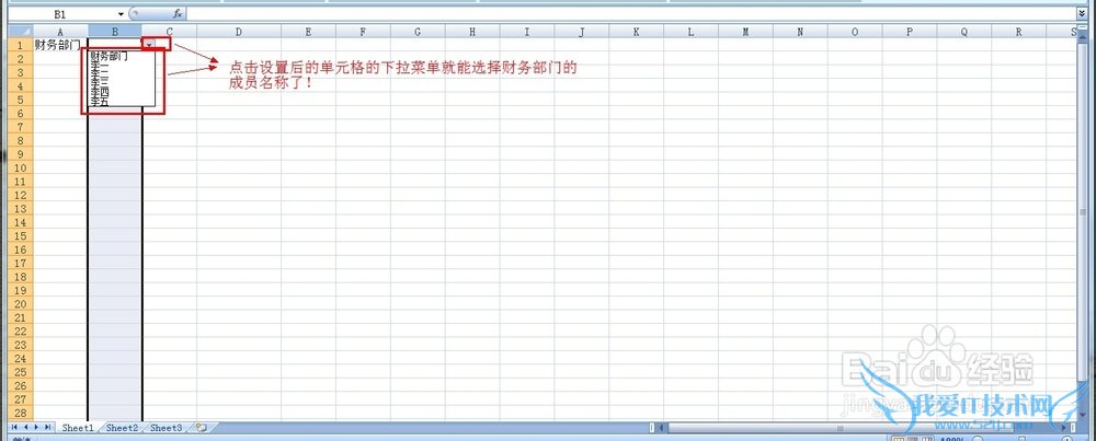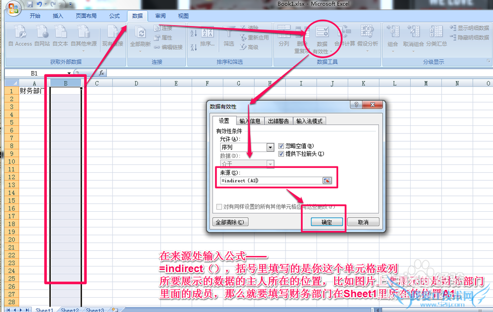 再选中需要输入该部门人员的列(如B列),再打开“数据有效性”对话框,选中“序列”选项后,在“来源”方框中输入公式:=INDIRECT(A1),确定退出。