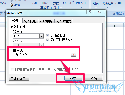 3.切换到Sheet1中,选中需要输入“部门类别”的列(如A列),执行“数据-有效性”命令,打开“数据有效性”对话框。在“设置”标签中,单击“允许”右侧的下拉按钮,选中“序列”选项,在下卖弄的“来源”方框中,输入“=部门类型”,即我们在Sheet2给所有部门类型名称区域定义的总名称,也就是说现在这列将显示部门类型下面的具体的部门名称。确定退出。