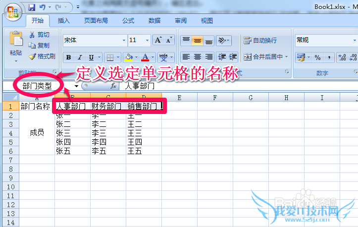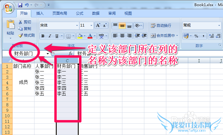 2.选中C列(“财务部门”名称所在列),在“名称”栏内,输入“财务部门”字符后,按“回车”键进行确认。
