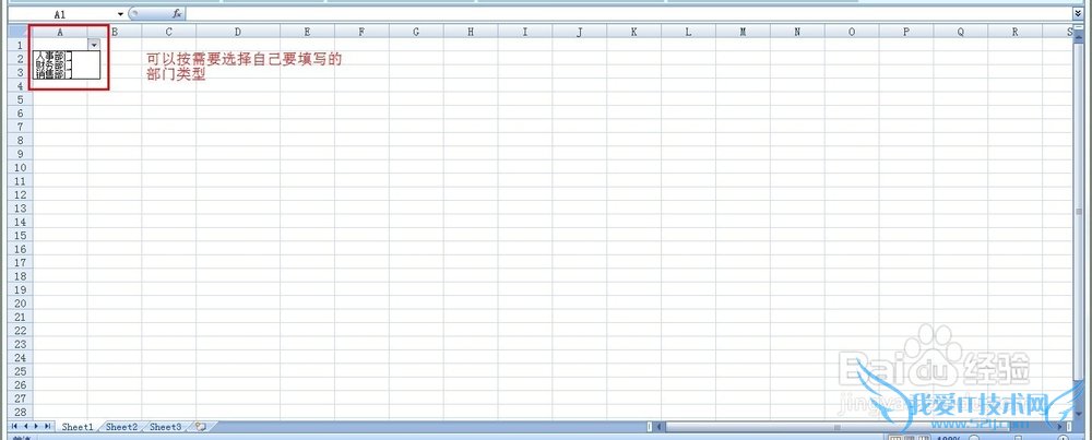 4.选中B列任意单元格(如A1),单击右侧下拉按钮,选择相应的“部门类型”填入单元格中。