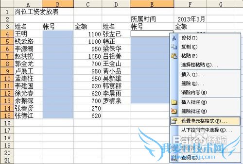当在表格中输入大于11位的数字时,需要对表格进行单元格格式的设置。选中需要输入帐号的单元格,右击选中“设置单元格格式”