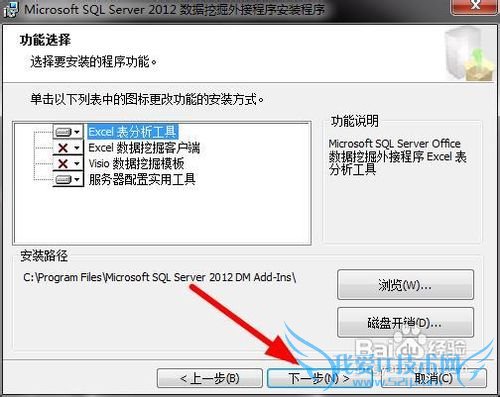 我们看【单击一下列表中的图标更改功能的安装方式】,【Excel数据挖掘客户端】一定要勾选,如图所示是错误的安装方式,要注意,然后点击下一步