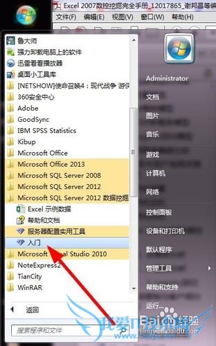 接着打开开始菜单,这里找到所有程序中的【sql server数据挖掘】下的【入门】