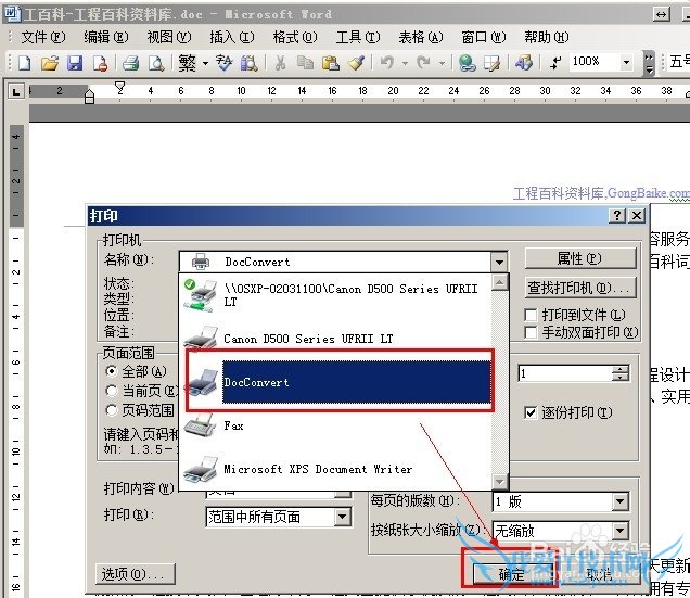 随便打开一个office文档,这里我们打开一个WORD文件示例,点击左上角的文件-打印,在弹出窗口里选择DocConvert这个打印机:
