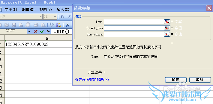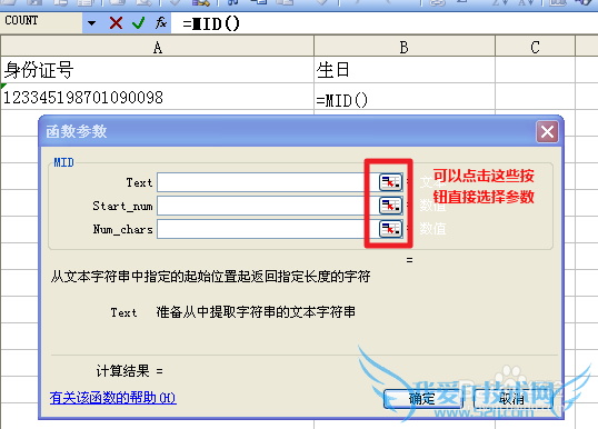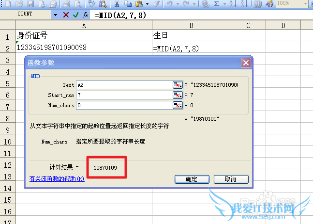 3,“123345198701090098”从第七位开始就是生日了,所以Start_num写7,要截取“19870109”Num_chars填写8(这里不是9,因为电脑的语言都是从0开始,所以是8)。