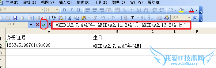 5,我们可以多运用几次函数,再运用符号“&”把字符连接起来。“=MID(A2,7,4)&"年"&MID(A2,11,2)&"月"&MID(A2,13,2)&"日"”。输入完后,点击左侧小对号。