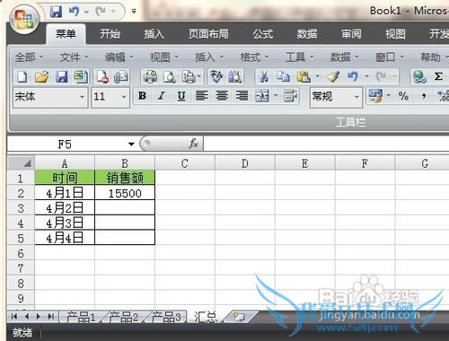 点击“汇总”表格,首先计算4月1日 产品1+产品2+产品3 的销售总额,选中要输入汇总数据的单元格,如图: