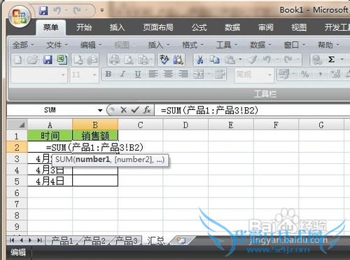 在单元格中输入公式=Sum(产品1:产品3!B2);公式中,产品1和产品3是指第一个表格和最后一个表格的名称,比如,有产品1 ~产品6 六个表格就写=Sum(产品1:产品6!B2);B2表示,待求和数据所在的单元格;