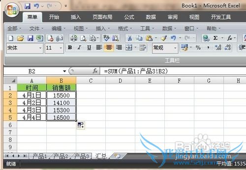 在我们的工作中,经常需要对一个工作簿中的多个表格进行求和,比如说要对下图中“产品1”、“产品2”、“产品3”的每日销售额进行求和,计算结果显示在“汇总”表格中,该如何操作呢?