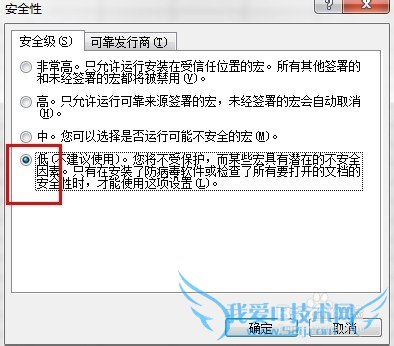 2、在对话框中,将安全级别选为“低”,“确定”退出。