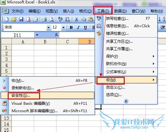 2、点“确定”打开工作簿,依次点击菜单“工具-->宏-->安全性”,打开“安全性”对话框。