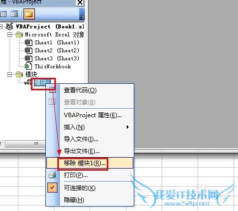 9、右键其中的“模块1”,并点选“移除模块1”。(如果还有其它模块,也要这样移除)