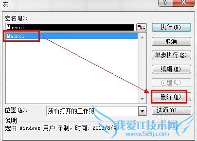 5、在“宏”对话框中,列出了宏名,选中后,点击“删除”按钮即可。
