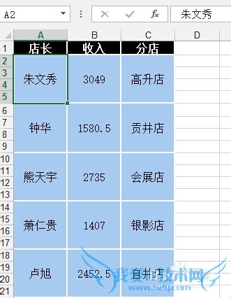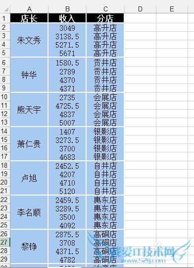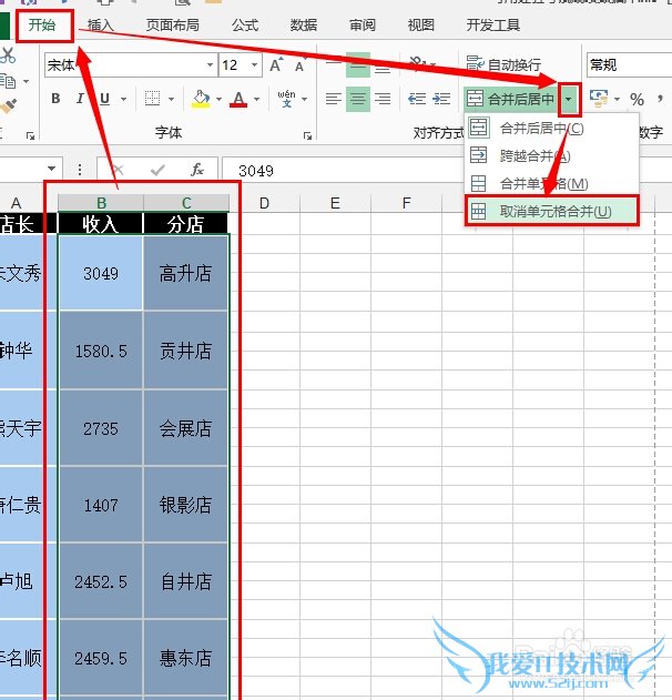 选择 收入和分店列里面的所有单元格,然后点击 开始, 合并后居中后面的下拉列表,然后选择 取消单元格合并: