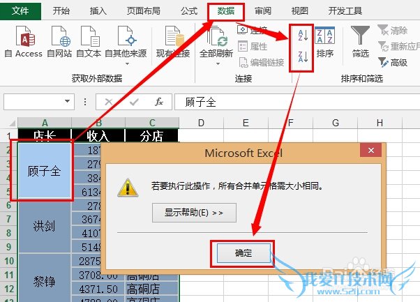 如下图所示,如果对合并单元格的列进行排序,就会提示 若要执行此操作,所有合并单元格需大小相同 :