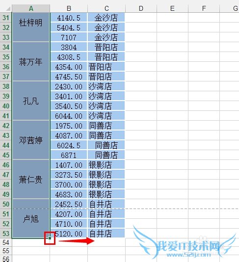 选择所有的合并单元格的列中的单元格,然后左键拖拽右下角的黑色块向右填充: