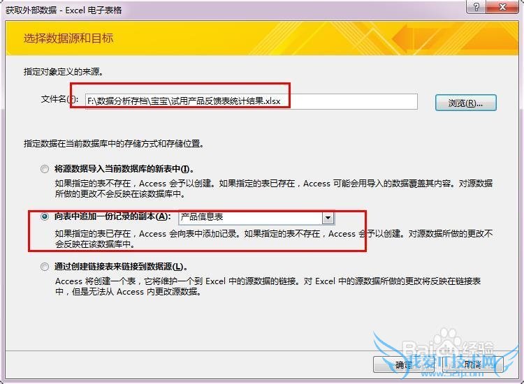 我们先要设定要导入的Excel文件,如图所示,可以点击【浏览】按钮来选择要导入的Excel文件;然后选择新建一个表还是在原有表的基础上追加记录,我选择了第二种,点击确定