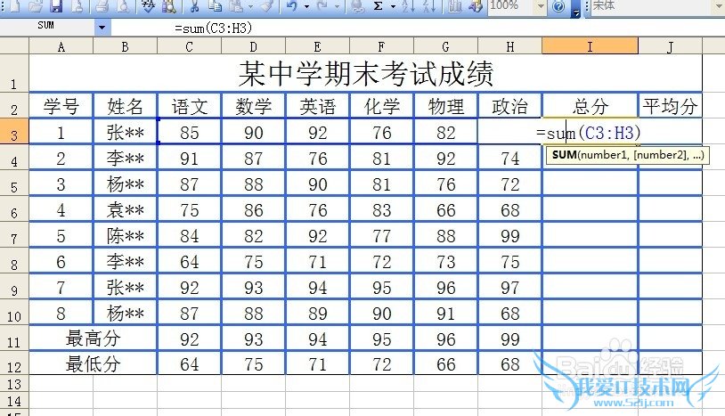 在第一行总分的这个单元格打出=sum(c3:h3),解释:c3:h3就是对应的c3到h3,包括了中间的d3、e3、f3、g3,