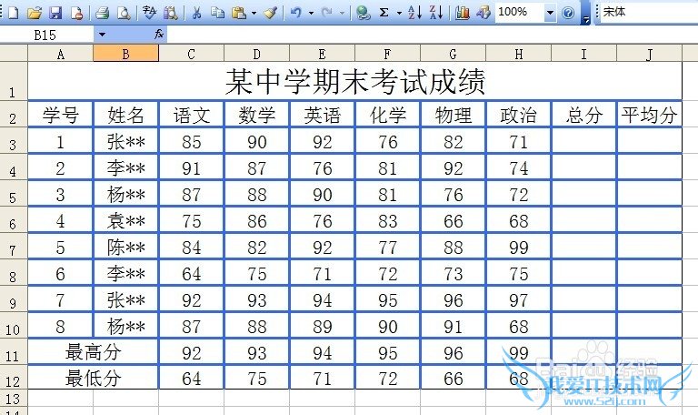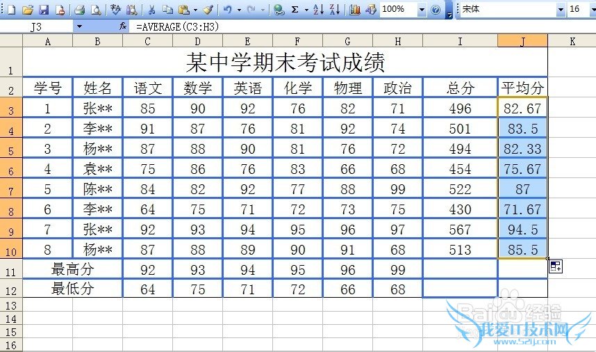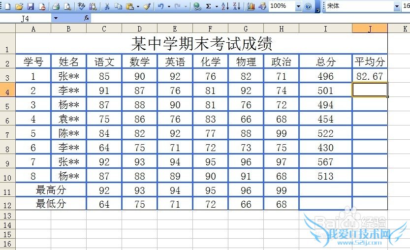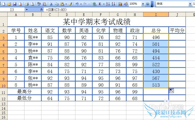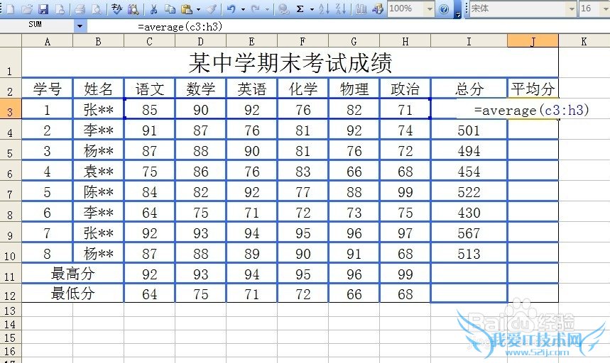 函数法是集合了公式法和自动求值的优点,它运算比较方便,数值放置是不受限制的,可以把算出的数值放在任意一个单元格,下面以例介绍如何使用求和函数sum和求平均值函数average: