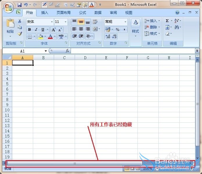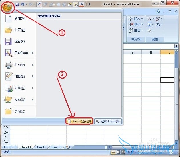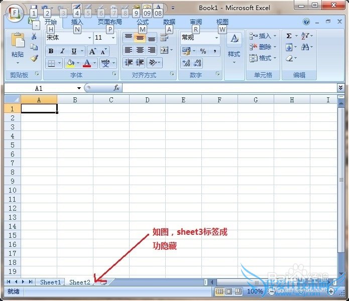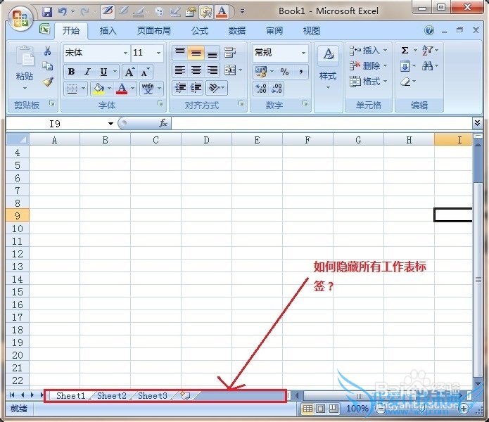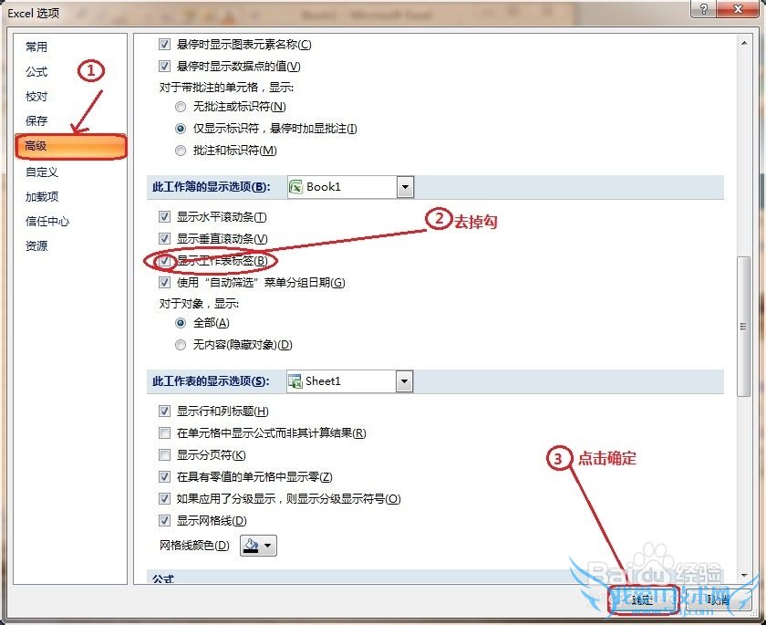 如图所示,要隐藏所有工作表标签,首先打开“office 按钮”,点击“excel选项”,选择“高级”在“此工作簿的显示选项”中,将“显示工作表标签”的勾去掉,然后点击“确定”就可以隐藏工作簿中的所有工作表标签。