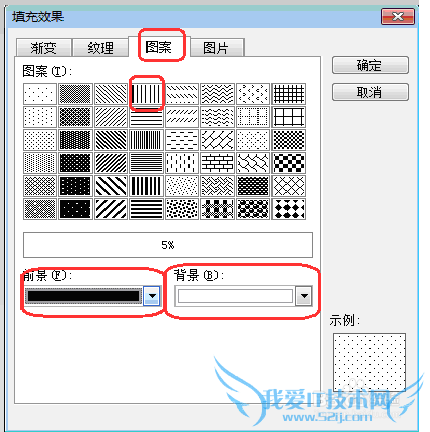 在又弹出的“填充效果”窗口中,选择“图案”菜单。在“图案(T)”下选择一种图案,如下图所示。“前景”选择黑色,“背景”选择白色。点击确定,再点击确定。