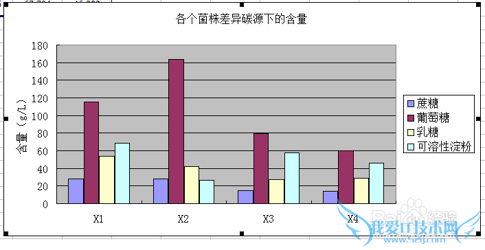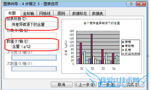 在弹出的窗口中的“图标标题”中输入“各个菌株的差异碳源下的含量”,“数值(Y)轴”中输入“含量(g/L)”,如下图所示。点击下一步,再点击完成。