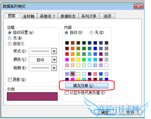 如果不进行各个柱颜色的修改,那么打印出来会是一片漆黑,很难看,因为黑白打印不能识别颜色。以最高那种颜色的柱为例,左键单击最高那根柱,然后右键单击,选择“数据系列格式”,在弹出的窗口中的“图案”菜单下,单击“填充效果”,如下图红色方圈所示。点击确定。