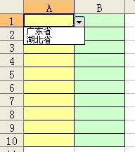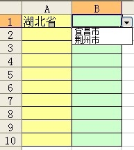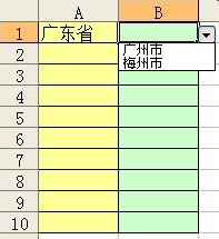 设置好以后,在A1:A10和B1:B10单元格就能实现联动下拉选择了,如图所示: